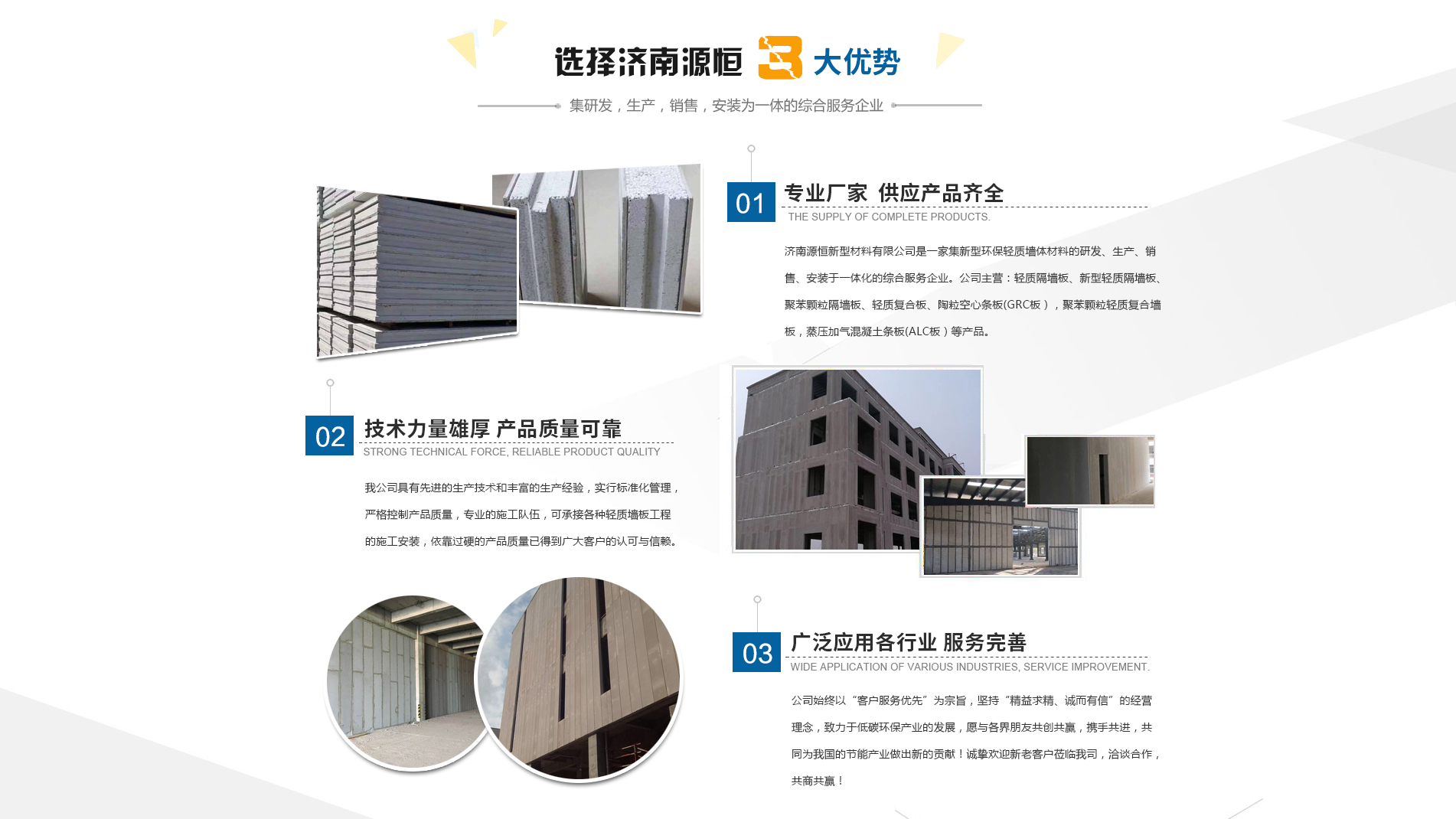 濟(jì)南源恒新型材料有限公司坐落于美麗的泉城濟(jì)南,是集新型環(huán)保輕質(zhì)墻體材料的研發(fā)、生產(chǎn)、銷售、安裝于一體化的綜合服務(wù)企業(yè)。我公司具有的生產(chǎn)技術(shù)和豐富的生產(chǎn)經(jīng)驗(yàn),為您提供輕質(zhì)隔墻板、新型輕質(zhì)隔墻板、聚苯顆粒隔墻板、輕質(zhì)復(fù)合板、陶??招臈l板(GRC板),聚苯顆粒輕質(zhì)復(fù)合墻板,蒸壓加氣混凝土條板(ALC板)等產(chǎn)品,本公司有專的施工隊(duì)伍,可承接各種輕質(zhì)墻板工程的施工安裝。輕質(zhì)隔墻板是國家推廣使用的新型輕質(zhì)、綠色無害建材,是墻改節(jié)能政策大力扶持的環(huán)保節(jié)能產(chǎn)品,是發(fā)達(dá)國家普遍采用的新型墻體材料。濟(jì)南源恒新型材料有限公司實(shí)行標(biāo)準(zhǔn)化管理,嚴(yán)格控制產(chǎn)品質(zhì)量,依靠過硬的產(chǎn)品質(zhì)量已得到廣大客戶的認(rèn)可與信賴。公司產(chǎn)品遍布各大城市,與國內(nèi)多家客戶建立了良好的合作關(guān)系。公司始終以“客戶服務(wù)優(yōu)先”為宗旨,堅(jiān)持“精益求精、誠而有信”的經(jīng)營理念,致力于低碳環(huán)保產(chǎn)業(yè)的發(fā)展,愿與各界朋友共創(chuàng)共贏,攜手共進(jìn),共同為我國的節(jié)能產(chǎn)業(yè)做出新的...